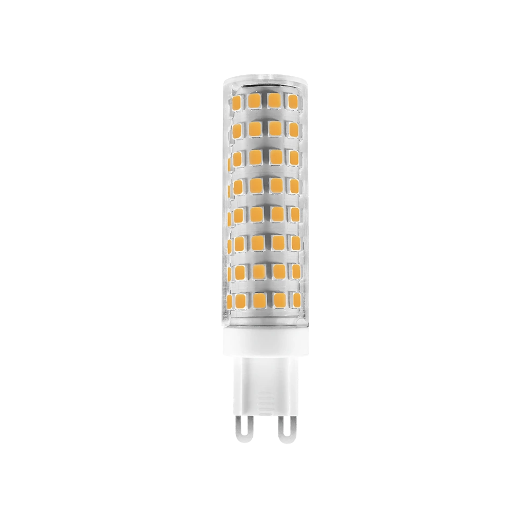 Lámpara base G9, de led, blanco cálido, 9 Watts, óptica 270°, cerámica con cubierta acrílico transparente, 110 – 265 Vca, protección IP20