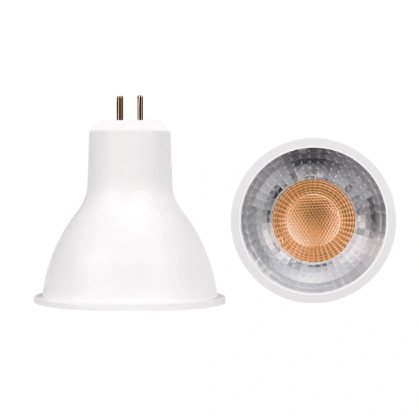 Lámpara tipo dicroico base MR16, de led, blanco cálido, 7 Watts, óptica 38°, carcasa de plástico cubierta transparente, 110-130V ca, protección IP20.