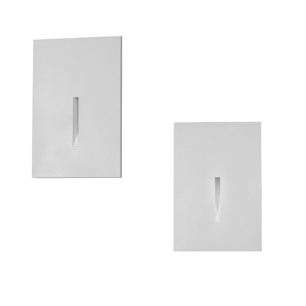 Luminario de LED para cortesía en pared, blanco cálido, 2 Watts, óptica 120°, luz indirecta frontal / inferior, rectangular, de empotrar, policarbonato acabado blanco, con sensor de movimiento 85-265V ca, protección IP65