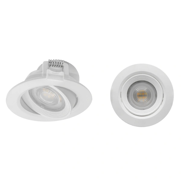 Luminario de techo, de LED, con temperatura de color seleccionable mediante interruptor, 7 Watts, óptica 60°, redondo, de empotrar, dirigible, policarbonato acabado blanco, 100-240V ca, protección IP54.