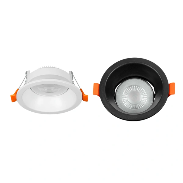 Luminario de techo, de led, blanco cálido, 5 Watts, óptica 53°, redondo, de empotrar dirigible, policarbonato acabado negro, 100 – 240 V ca, protección IP20.
