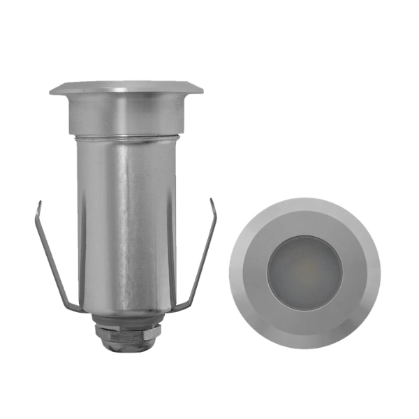 Luminario de piso, de led, blanco cálido, 1 Watt, óptica 120°, redondo, de empotrar, aluminio incluye housing, 85-265V ca, protección IP65.