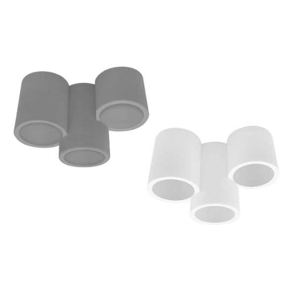 Luminario de techo, con 3 bases GU10 (sin lámpara) de 25 Watts máximo cada una, óptica de 120°, de sobreponer, concreto acabado gris, protección IP20.