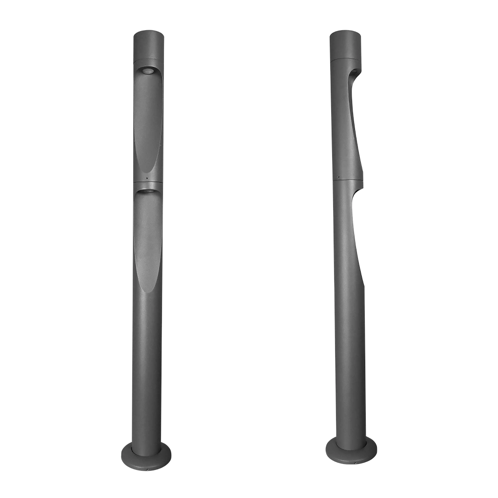 Luminario de LED tipo bolardo cilíndrico de 60 cm de alto, blanco cálido, 6 Watts y de 80 cm de alto, blanco cálido, 12 Watts, óptica de 120°, de sobreponer, aluminio acabado gris, 100-240 V ca, protección IP65