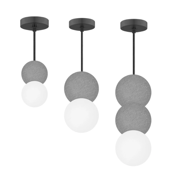 Luminario de suspender, con base G9 (sin lámpara) 15 Watts máximo, óptica 120° de sobreponer, concreto acabado gris, esfera de cristal de 8cm, protección IP20.