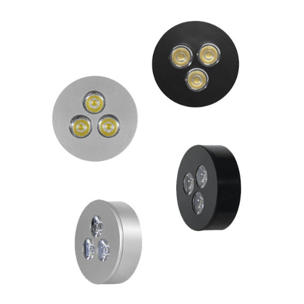 Luminario de techo, de led, blanco cálido, 3 Watts, óptica 45°, redondo, de empotrar o sobreponer, plástico y aluminio acabado negro incluye housing sin driver (requiere HYLED350MA03SN o ILUK300MA03W), 3-12V cc, protección IP20.