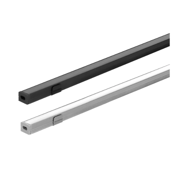 Kit de perfil para tira extraplana de led, sin ceja, que incluye, perfil rectangular de aluminio acabado negro de 2 m, mica difusa de 2 m, kit de 2 tapas laterales y kit de 2 grapas, de empotrar o sobreponer, protección IP20.