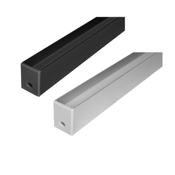Kit de perfil para tira extraplana de led, sin ceja, que incluye, perfil rectangular de aluminio acabado negro de 2 m, mica difusa negra traslucida de 2 m, kit de 2 tapas laterales y kit de 2 grapas, de empotrar o sobreponer, protección IP20.