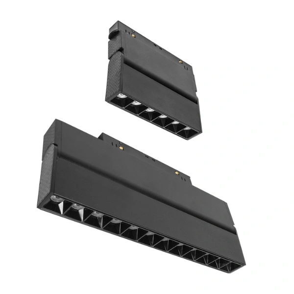 Luminario para riel magnético, puntual rectangular , dirigible, de led, blanco cálido, 12 Watts, óptica 24°, aluminio acabado negro, 48V cc, protección IP20.