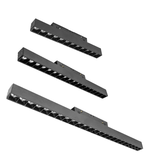 Luminario para riel magnético puntual rectangular , de led, blanco cálido, 18 Watts, óptica 24°, aluminio acabado negro, 48V cc, protección IP20.