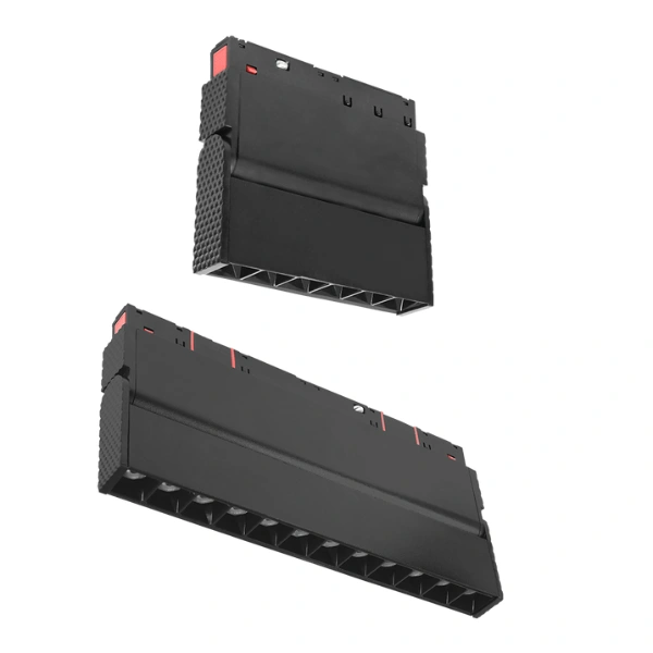 Luminario para riel magnético, puntual rectangular, dirigible, de LED, 2700 K / 4100 K / 5500 K, 6 Watts, óptica 24°, aluminio acabado negro, 48V cc, protección IP20, con cambio de temperatura de color controlado vía aplicación.