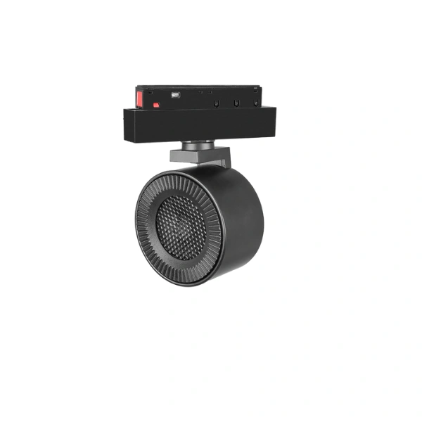 Luminario para riel magnético, sobrepuesto redondo, de LED, con filtro tipo louver honey, 2700 K / 4100 K / 5500 K, 15 Watts, óptica 24°, UGR 19, aluminio acabado negro, 48V cc, protección IP20, con cambio de temperatura de color controlado vía aplicación.