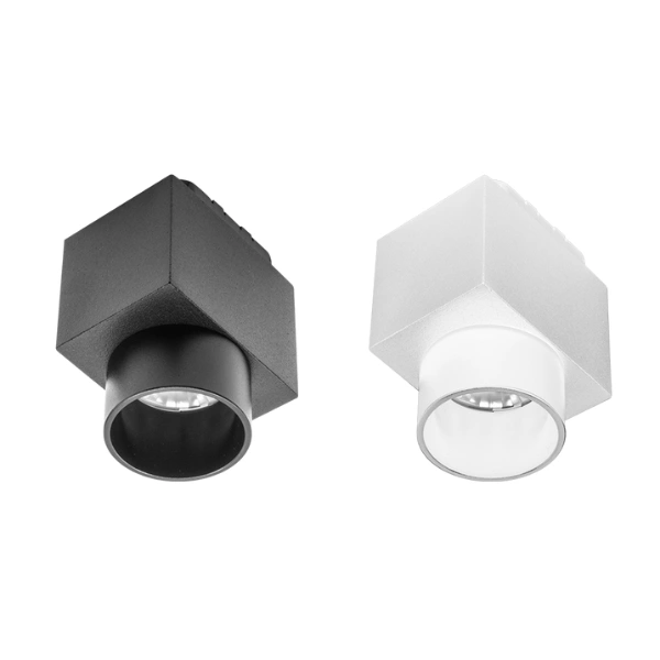 Luminario para mini riel magnético, cuadrado de sobreponer con arillo antideslumbrante, de LED, blanco cálido, 6 Watts, óptica 30°, aluminio acabado negro, 48 V cc, protección IP20.