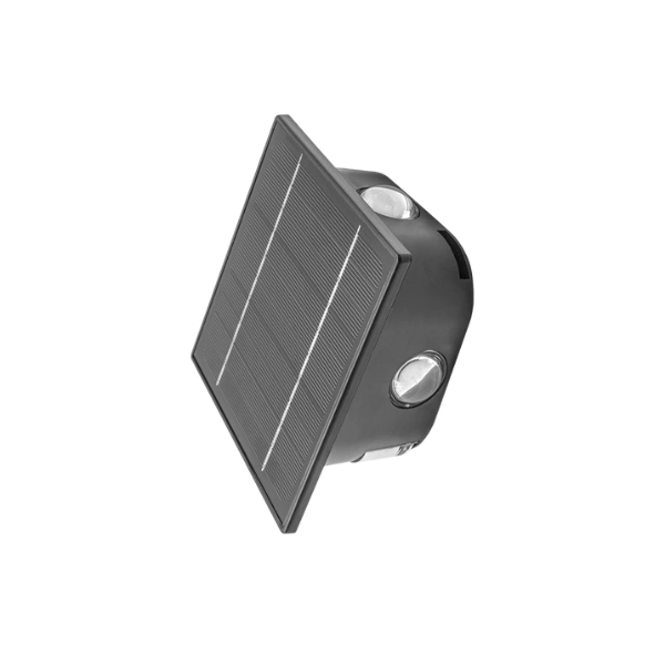 Luminario solar, de LED, blanco cálido con 6 lentes, 2 Watts, óptica 360°, cuadrado, de sobreponer en pared, policarbonato acabado negro, dos niveles de brillo seleccionables con interruptor, batería de litio de 3.2 Vcc 1300 mAh remplazable, protección IP54.