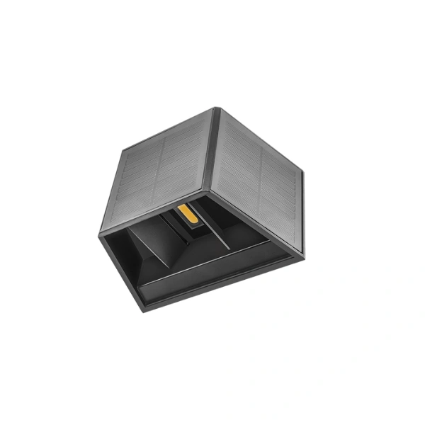 Luminario solar, de LED, blanco cálido, con dos salidas de luz y cortadores ajustables, 3 Watts, de sobreponer en pared, policarbonato acabado negro, batería de litio de 3.7 Vcc 1300 mAh reemplazable, protección IP54.