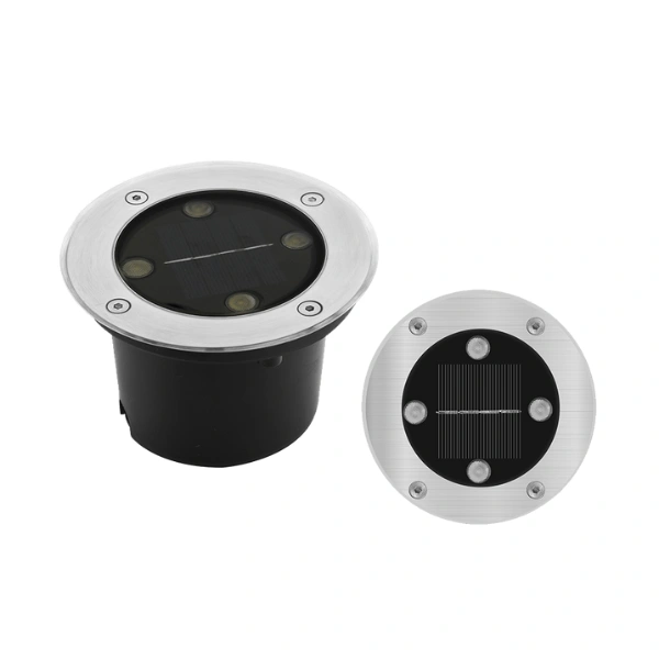 Luminario solar, de led, blanco cálido, 4 Watts, óptica 120°, redondo, de empotrar, acero inoxidable, sensor de obscuridad, batería de litio de 1.2V 600 mAh remplazable, incluye housing, este luminario NO debe de pisarse, protección IP67.