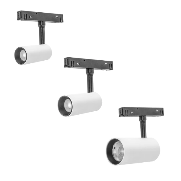 Luminario para riel magnético, tipo spot, dirigible, de LED, blanco cálido, 7 Watts, óptica 24°, aluminio acabado blanco, 48V cc, protección IP20, atenuable.
