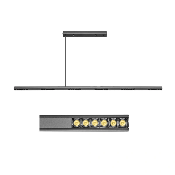 Luminario de LED, blanco cálido, 25 Watts, óptica 36°, rectangular, de suspender (incluye cánope para sobreponer en techo), aluminio acabado negro, 85-265V ca, protección IP20.