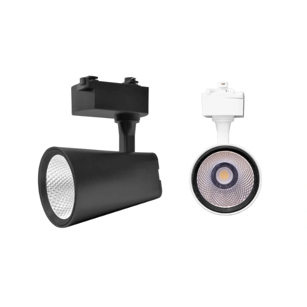 Luminario para riel electrificado, de led, blanco neutro, 30 Watts, óptica 35°, de sobreponer dirigible, plástico ABS aluminio/ acrílico acabado negro, 85-265V ca, protección IP20.