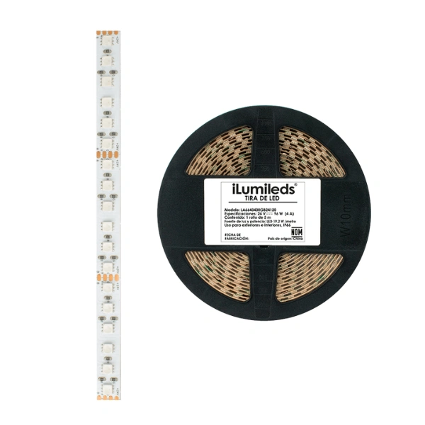 Tira extraplana, de led 4040 5m con 120 leds por metro, RGB, 19.2 Watts por metro, óptica 120°, pista de cobre acabado blanco cubierta barniz nano al alto vacío con autoadhesivo 3M PCB 2 oz doble cara, 24V cc, protección IP66.