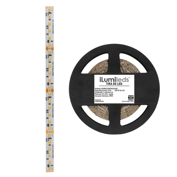 Tira extraplana, de led con 240 leds por metro, cambio de color por medio de atenuación tipo PWM, 1800 K (Blanco cálido)-3500 K, 21.2 Watts por metro, óptica 120°, pista de cobre acabado blanco con auto adhesivo 3M CRI 90 PCB 2 oz doble cara, 24V cc, protección IP20.