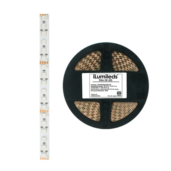 Tira extraplana, de led 4040 5m con 120 leds por metro, RGB, 19.2 Watts por metro, óptica 120°, pista de cobre acabado blanco con autoadhesivo 3M PCB 2 oz doble cara, 24V cc, protección IP20.