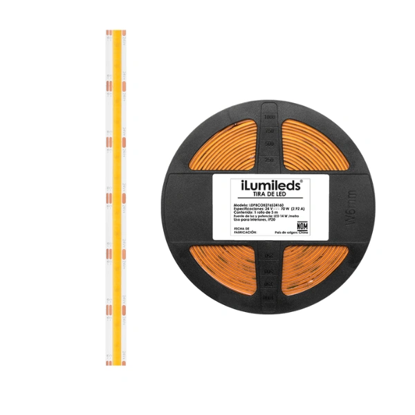 Tira extraplana, de led COB, 5m, cambio de color por medio de controlador LTCTRI-WW , 2700 K (Blanco cálido)-6500 K (Blanco) K, 14 Watts por m, óptica 120°, pista de cobre acabado blanco con auto adhesivo 3M CRI 90 PCB 2 oz doble cara, 24V cc, protección IP20.